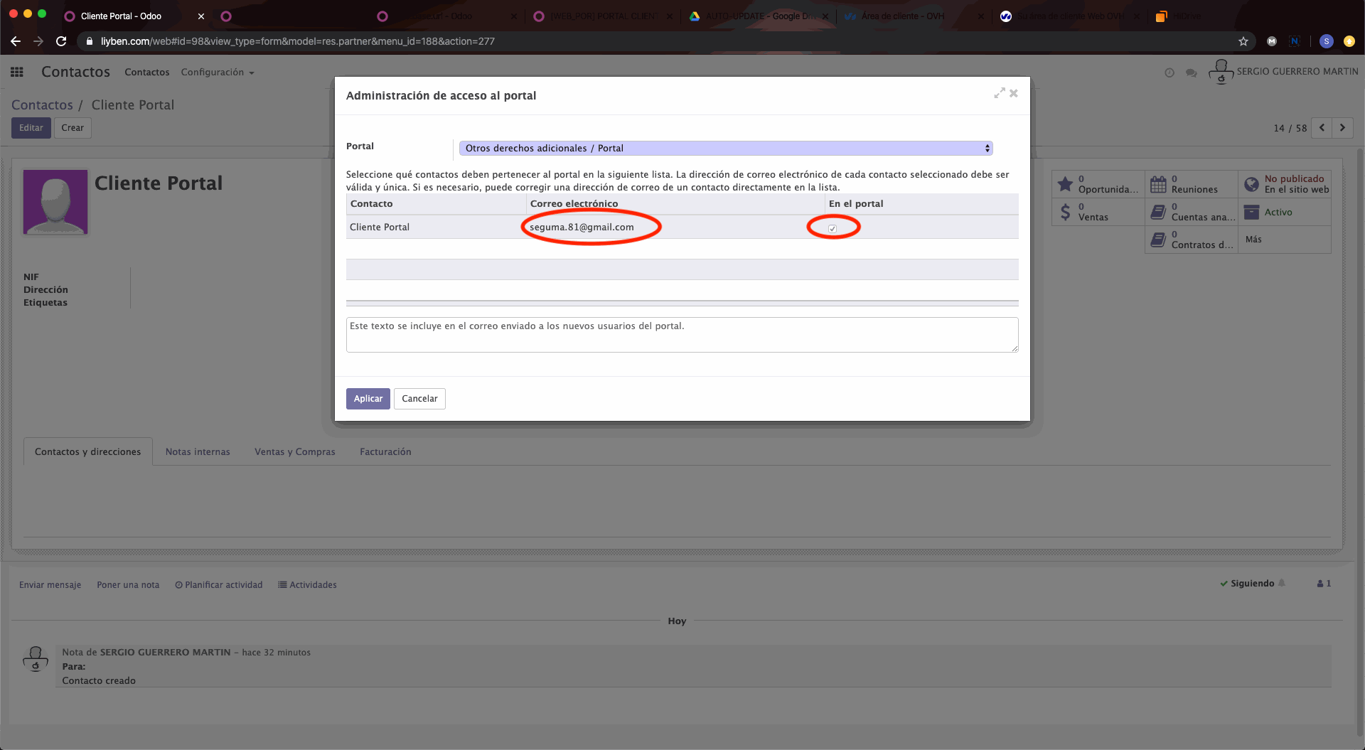 En la ventana emergente seleccione la casilla En el Portal. Asegurase que el campo Correo electrónico se encuentra relleno con el email correcto. Tambien puede agregar contenido al email que se enviará, rellenando la casilla de texto en el pie de la ventana emergente. Por último haga click en Aplicar cuando haya terminado.