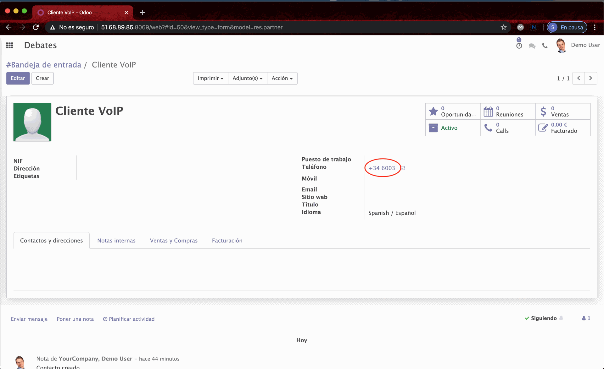 Para realizar llamadas desde Odoo debemos de ir al registro el cual tiene el registro que tiene el número de teléfono al que queremos llamar. En este ejemplo llamaremos a un cliente usando un softphone: