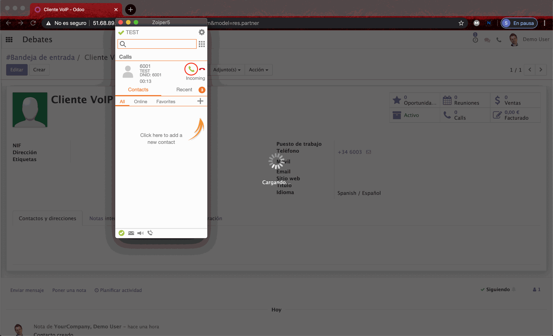 Buscamos al cliente al cual queremos llamar haciendo click sobre el número de teléfono. Al hacerlo tendremos una llamada entrante en nuestro softphone, si usamos un teléfono ip pues este recibirá esa llamada.