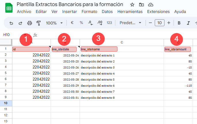 1. Id: Introducir un valor único en todas las filas 2. line_ids/date: Fecha de cada extracto 3. line_ids/payment_ref: Descripción de cada extracto 4. line_ids/amount: Importe de cada extracto.