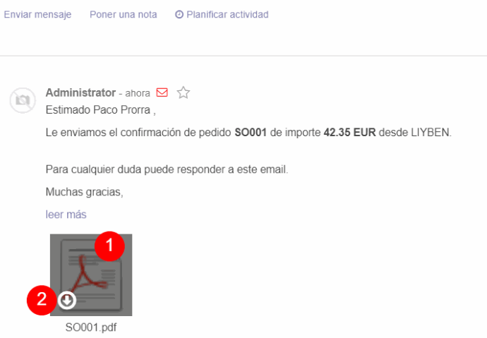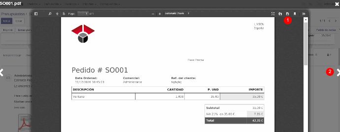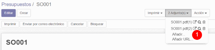 El módulo agrega dos pequeños iconos de vista previa de impresión a la derecha de los enlaces de descarga para archivos adjuntos o campos binarios. El icono de la Lupa abre la visualización en la misma pantalla y el icono de la Flecha en otra pestaña del navegador.USO 2